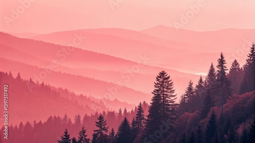 Moody layered mountain landscape with dense pine forest and dramatic pink filter