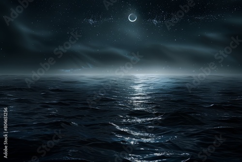 Moonlit ocean under starry sky with crescent moon, creating a serene and tranquil night seascape, perfect for contemplative themes.