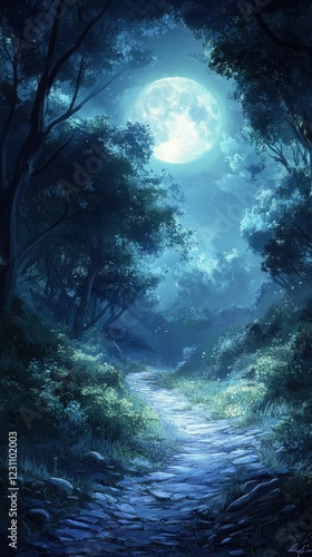 Moonlit Path Through A Serene Forest At Night