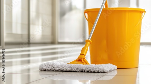 Mop and bucket in a sunlit room Concept, Bright Yellow Mop Bucket with Wringer Beside Wet Floor for Cleaning Purpose in Modern Space