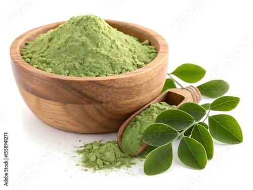 Moringa powder in wooden bowl and scoop with fresh leaves isolated on white background