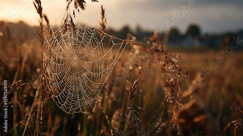 Morning dew glistens on intricate spiderweb in golden sunrise light, nature's delicate art