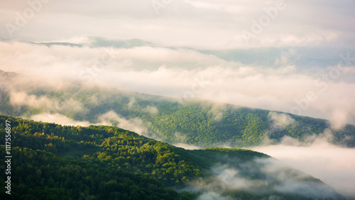 morning fog in mountains. alpine scenery. countryside landscape in spring. breathtaking nature environment. tranquil weather