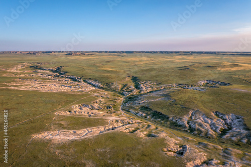 morning light over arroyo and badlands in Pawnee National Grassland in northern Colorado, early summer scenery aerial view of Main Draw area