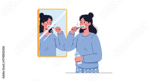 Morning routine with a young woman brushing her teeth in front of the mirror at home with a modern artistic style