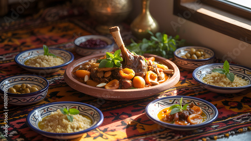 Moroccan lamb tagine with apricot and almonds served with couscous on traditional ceramic plates