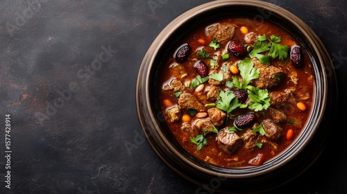 Moroccan Lamb Tagine with Dates and Fresh Herbs in Minimalist Setting