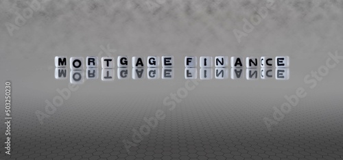 mortgage finance word or concept represented by black and white letter cubes on a grey horizon background stretching to infinity