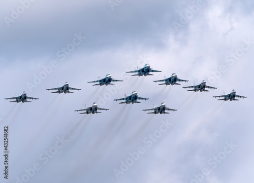 MOSCOW, RUSSIA - MAY 7, 2021: Avia parade in Moscow. su-35 and su-34 and su-30 in the sky on parade of Victory in World War II in Moscow, Russia