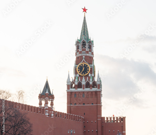 Moscow, Russia. View ot the Moscow Kremlin wall and Spasskaya tower. Sunset with clouds