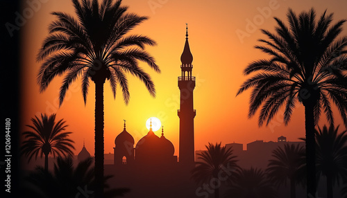 Mosque silhouette with palm trees at sunset