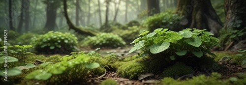 Moss-covered Pilea microphylla plants on a forest floor, woodland flora, dense underbrush, leafy landscape