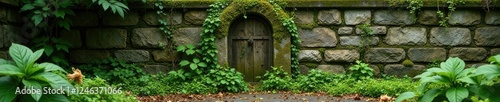 Moss-covered stone walls with ivy vines and dead flowers, ivy, moss