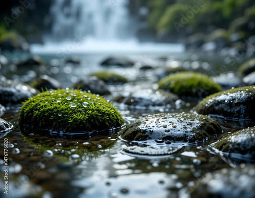 Mossy Rocks in Stream with Waterfall Background
