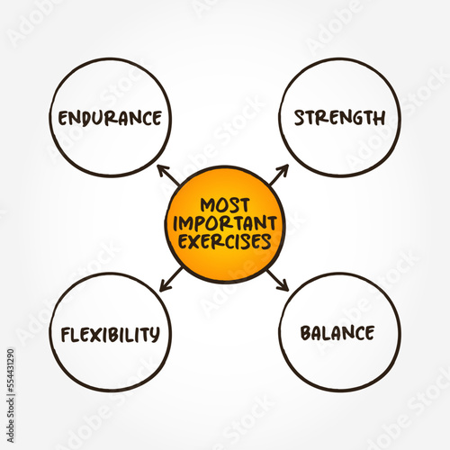 Most important exercises (performance of some activity in order to develop or maintain physical fitness and overall health) mind map text concept background