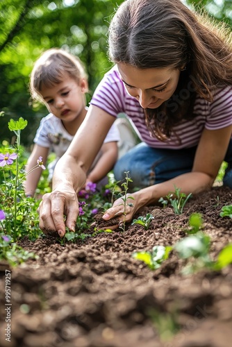 mother and child are planting flowers in the flowerbed. Selective focus