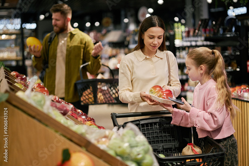 Mother and daughter discussing fresh produce selection in a supermarket fruit section with a man selecting a melon in the background, creating an engaging shopping experience