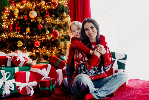 Mother and daughter joyfully celebrating Christmas at home surrounded by festive gifts and a decorated holiday tree.