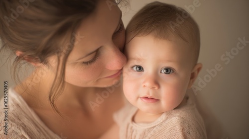 Mother and infant in tender embrace, capturing love and connection in soft pastel tones.