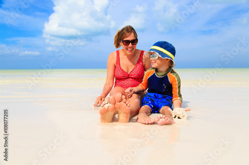 mother and son feet on summer beach