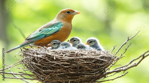 Mother bird and her baby birds in a nest, a symbol of family and spring