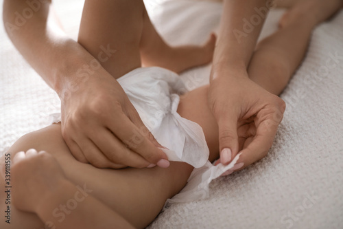 Mother changing baby's diaper on bed at home, closeup