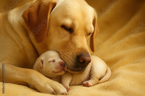Mother dog and her newborn puppy cuddle with tenderness and love. This animal family moment shows pure affection and care, gentle moment on soft blanket