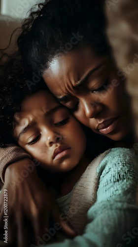 Mother Embraces Child, Expressing Sadness and Concern in Close-up Photo