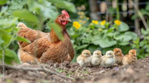 Mother hen and adorable chicks in a picturesque natural environment, beautiful scenic background