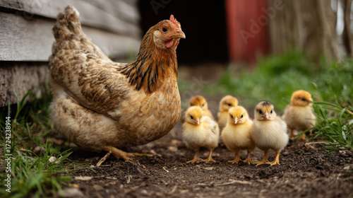 Mother hen with fluffy yellow chicks standing on dirt path beside wooden barn in bright green grass under warm sunlight.