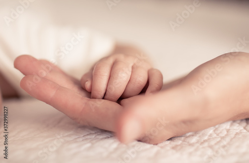 Mother holding tiny newborn baby hands.