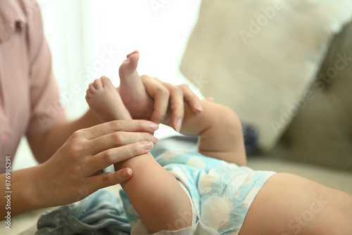 Mother taking care of her baby boy on the bed, changing diapers and clothes. Childcare and motherhood concept