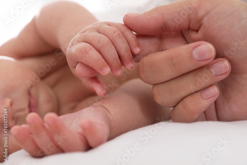 Mother with her cute baby on bed, closeup of hands