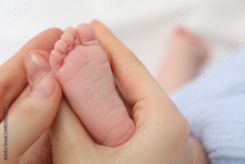 Mother with her little baby on bed indoors, closeup