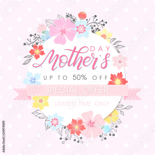 Mothers Day special offer.Mothers Day - Hand painted lettering with floral elements,leaves and flowers. Mothers Day sale banner perfect for prints,flyers,cards,promos,holiday invitations and more.