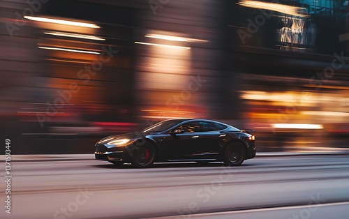 Motion blur shot of luxury car passing modern corporate skyscraper, dynamic urban business lifestyle scene --ar 16:10