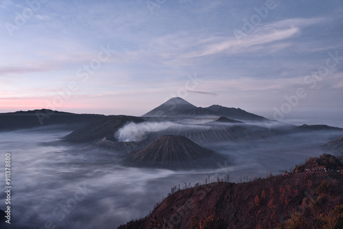 Mount Bromo volcano (Gunung Bromo) during sunrise on Mount Penanjakan, in East Java, Indonesia.