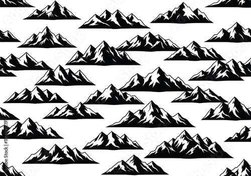 Mountain, black and white, pattern, sharp, angular, snow-capped, seamless, repeat, graphic, bold, design, wallpaper, textile, nature, illustration, peak, landscape, abstract, horizontal, dynamic