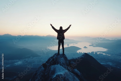 Mountain climber celebrates at sunrise overlooking a valley and cityscape in South Korea