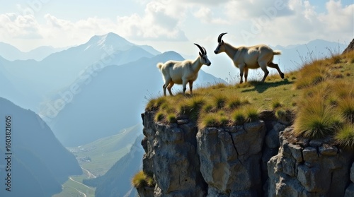 Mountain goats grazing on clifftop alpine landscape nature photography scenic view wildlife concept