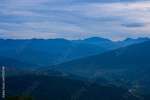 Mountain green valley and cloudy rainy sky.Pasture in mountain valley, Mountain landscape, Natural background