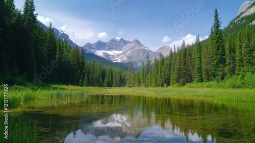 Mountain lake reflection, serene forest landscape, tranquil valley, summer day, travel postcard