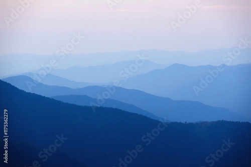 mountain landscape at dawn or dusk layered ranges soft gradient sky