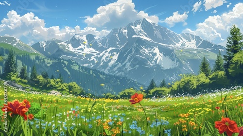 Mountain Landscape in Spring: Capture the stunning beauty of mountains in springtime, with blooming flowers,