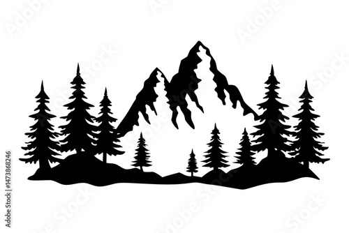 Mountain Landscape Silhouette with Pine Trees, Majestic Mountain Scene, Pine Tree Silhouette, Rugged Terrain Art, Transparent Background