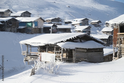 mountain landscape slopes covered with snow can be seen a tree fence and a house.savsat/artvin