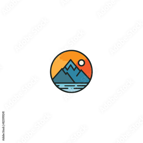 mountain logo landscape with rocks at sunrise, Sea and Sun for Hipster Adventure Traveling logo
