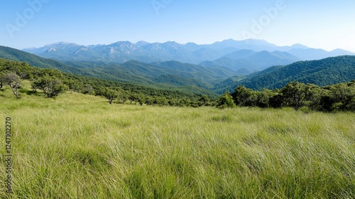 Mountain meadow landscape, summer day, scenic view, travel poster