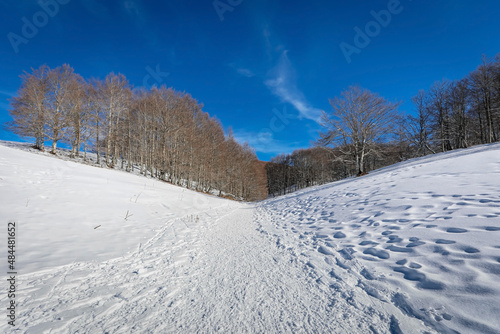 Mountain path covered with snow in the winter forest. Mountain road covered with snow.