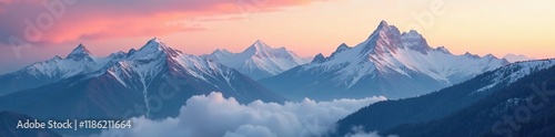 Mountain peaks are shrouded in mist and fog at sunrise, foggy peaks, alpine scenery, snowy mountain landscape sunrise
